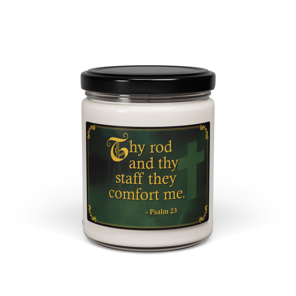 Upgrade your home decor with this custom candle, featuring the timeless words of Psalm 23: “Thy rod and thy staff they comfort me.” Soft, inviting, and crafted to perfection. With a clean-burning soy wax blend and a reusable glass jar, it suits self-care, home decor, and gifting. Customize the print label for both evergreen and seasonal collections. 100% natural soy wax blend. 100% cotton wick.